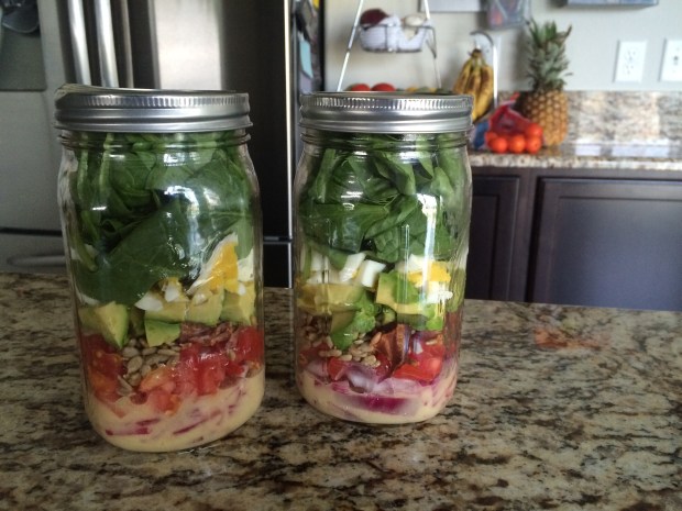 Prep all of the ingredients as above (cook your bacon and eggs, chop your vegetables and whisk together your dressing). BUT THEN! Using a quart sized mason jar, layer the dressing equally at the bottom of each. Next, add the onions followed by the tomatoes, sunflower seeds and bacon. Chop each the avocado and egg, layer one on top of the other, and season with salt and pepper to taste. Finish the salad by packing the greens on top of the rest of the ingredients and seal the lid tight.