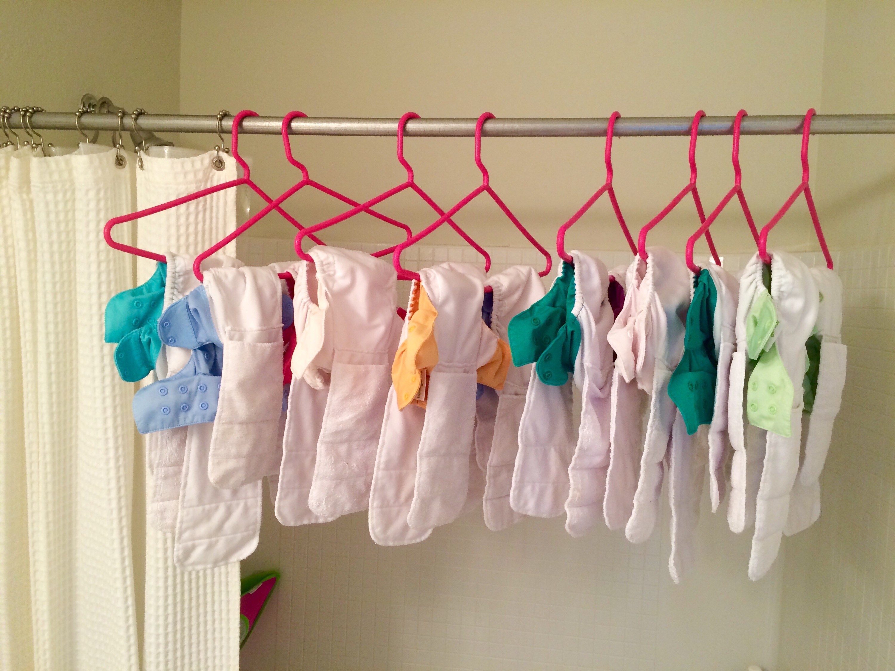 The process is pretty simple. First, I throw the entire diaper pail liner bag full of diapers in the washer and run a quick rinse cycle with cold water and no detergent (25 minutes). Next, I run a hot cycle with regular detergent (we use All Free and Clear) and a small scoop of OxiClean (1 hour). Once everything is clean, diapers get hung to dry while inserts, diaper pail liner and any wet bags go in the dryer. Once a month, I add 1/4 cup of bleach to the hot cycle to help strip any residual build-up. I currently do this process in the morning so I can fold and put the diapers away before bedtime. When I was working, we would start everything as soon as the last diaper of the night was on Cody’s bum. Because our nighttime routine included 60-90 minutes of nursing, the diapers were usually ready to be hung once she was asleep.