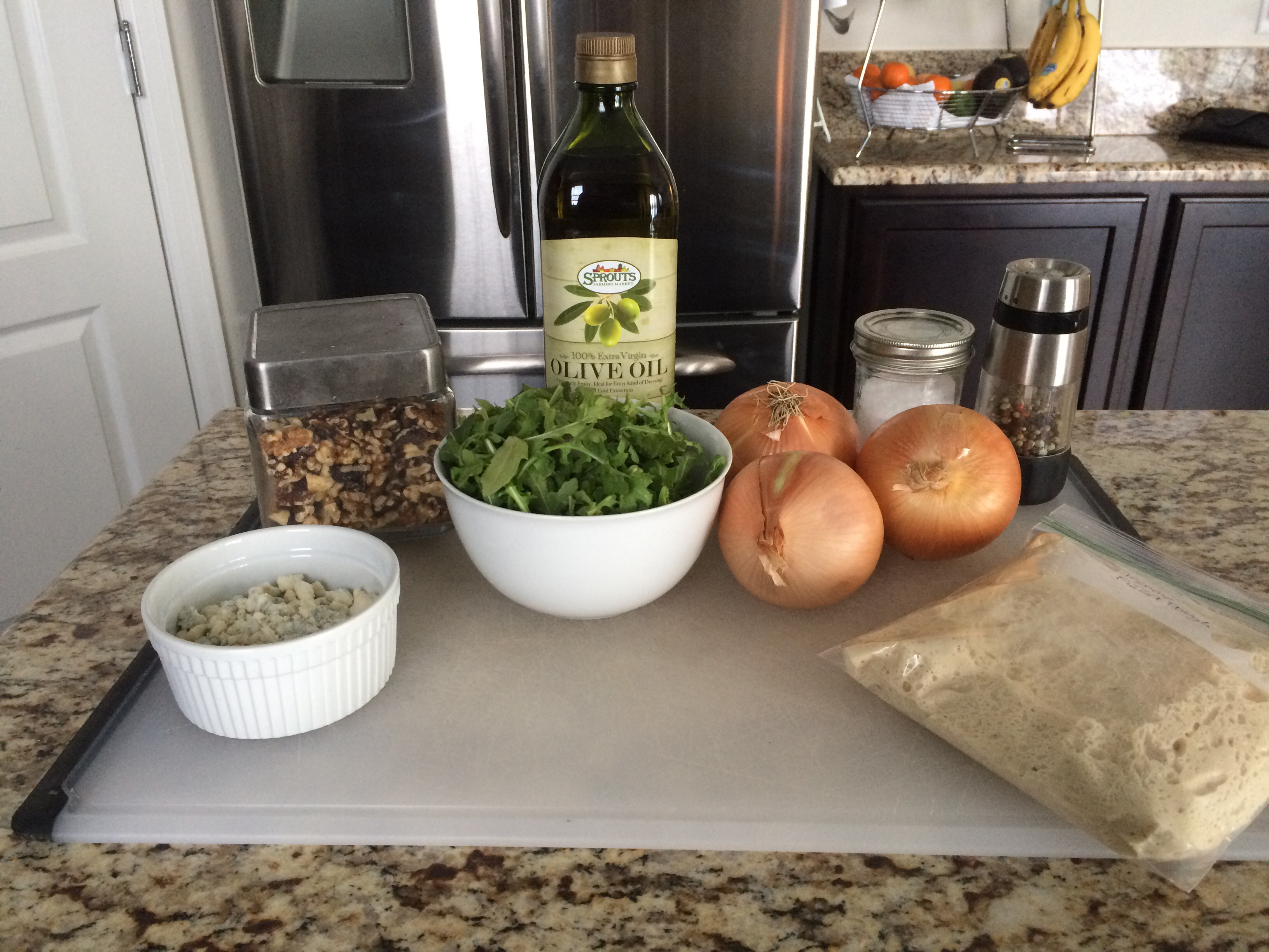 Top the dough with the onions and bake for 8-9 minutes, or until the dough is firm to the touch and just beginning to brown. Sprinkle the blue cheese and walnuts over the onions and return to the oven for another 3 minutes or until the cheese is just beginning to melt and the crust is a light golden brown.
